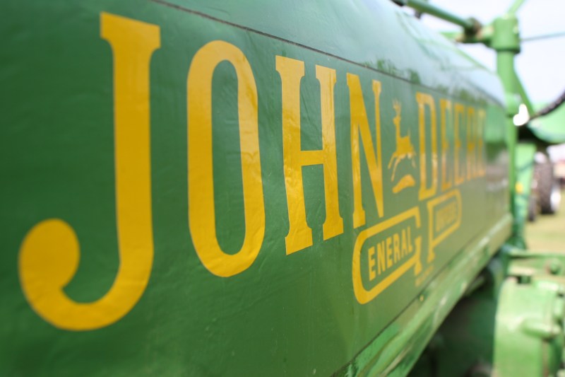 Identifying words on the side of a John Deere tractor at the Dundas show.