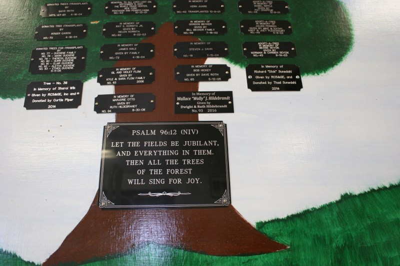 To my surprise, I discovered the literary arts on a tree mural memorial in the words of Psalm 96:12. Let the fields be jubilant, and everything in them. Then all the trees of the forest will sing for joy.