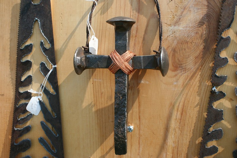 At the booth of Larry and Nicholas Ahrens, I found a gallery of garden art crafted from gas cans, shovels, railroad spikes, horseshoes, golf clubs and more. I admire the ingenuity of artists who can sculpt such art from what some might consider junk. This pair does it well.
