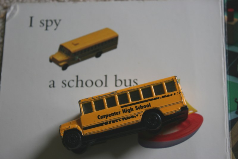 When Izzy opened an I Spy book, I showed her how a matchbox bus matched the photo. I said the word “bus,” then repeated myself. At 20 months, she’s learning new words at a rapid pace.