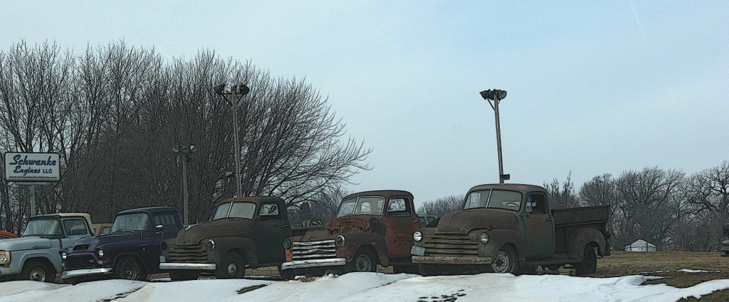 A row of vintage trucks are parked atop a hill on the east edge of Springfield.