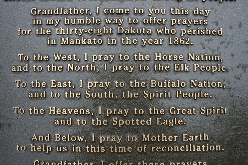 Words on a marker in Reconciliation Park in Mankato where 38 Dakota were hung on Dec. 26, 1862. Minnesota Prairie Roots file photo 2012.