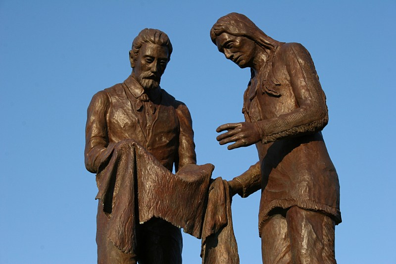 This sculpture of Alexander Faribault and a Dakota trading partner stands in Faribault’s Heritage Park near the Straight River and site of Faribault’s trading post. Faribault artist Ivan Whillock created this sculpture which sits atop a fountain known as the Bea Duncan Memorial Fountain. Minnesota Prairie Roots file photo.