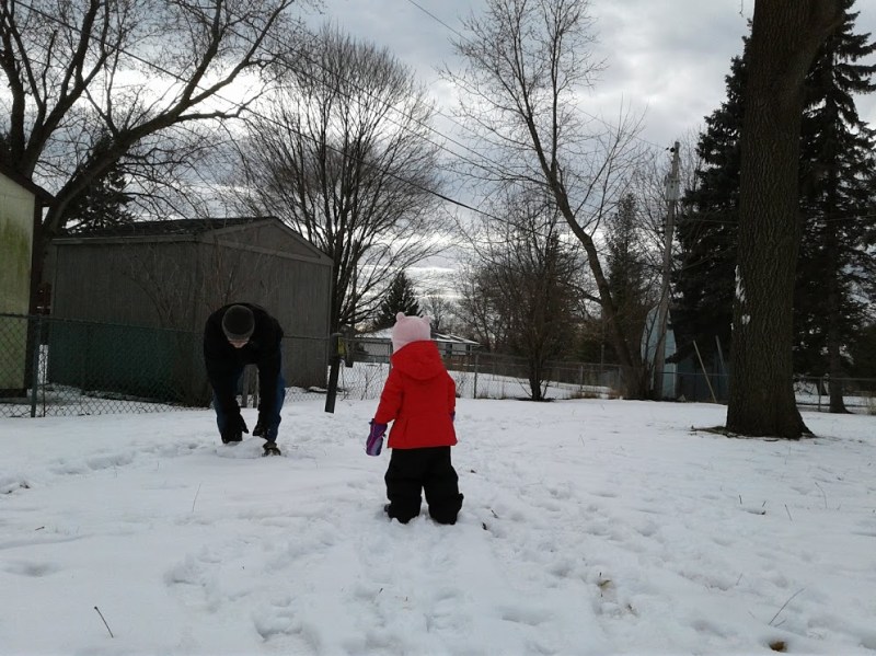 With temps around 40 degrees, I decided (and Grandpa went along with the idea) it would be a great day to play with Izzy in the snow. After I bundled her into her snowpants, boots, coat, cap and mittens and then got myself ready, we finally headed to the backyard. I’d forgotten how long it takes to get a little one into snow gear.