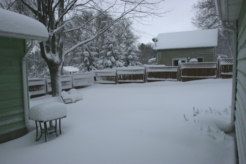 My patio and backyard photographed around 4 p.m. Monday when the snow let up for a bit. You can see the snow depth by looking at the table and the vintage lawn chairs near the tree to the left.