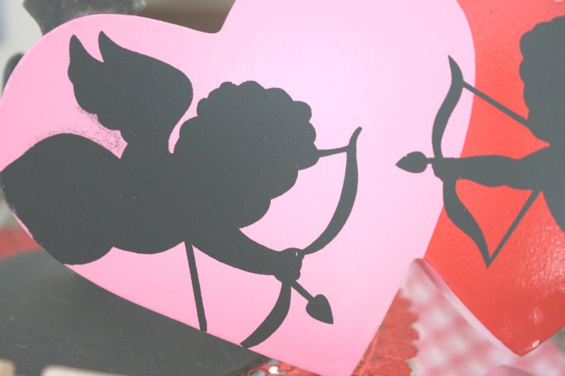 I created a love vignette on a chest of drawers in my dining room. Included are this wood cut-out, wedding photos and vintage and homemade valentines.