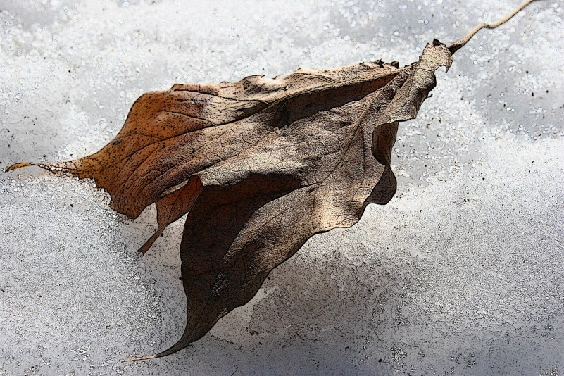 IN SNOW TINGED with dirt, a curled brown maple leaf lies, a remnant of autumn lingering in this month of February.