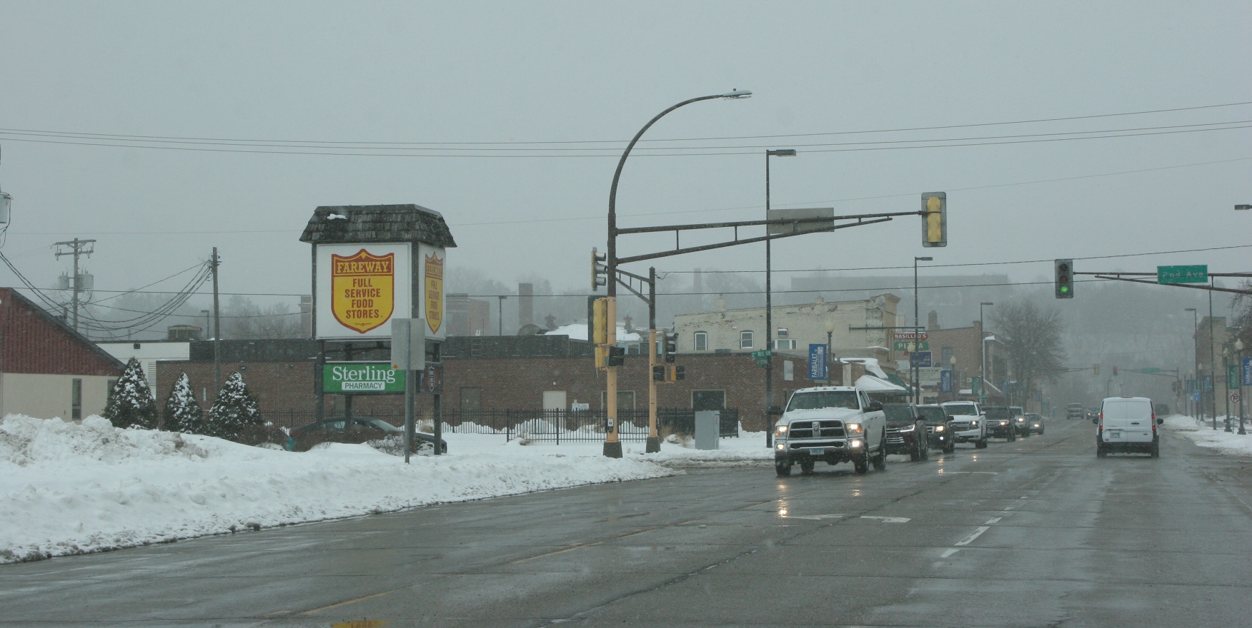 Light snow fell all day Sunday in Faribault as traffic drives here along Minnesota State Highway 60 in the downtown area.