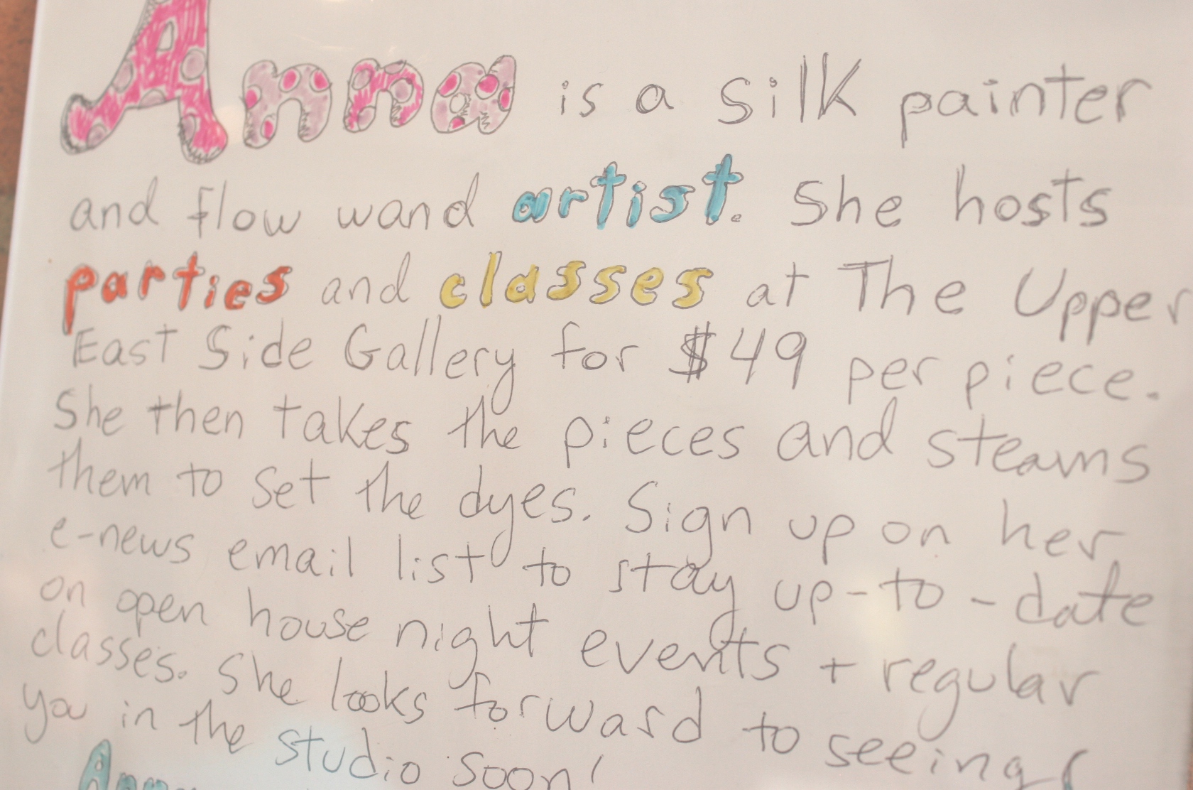 A sign on the wall notes the offerings of artist Anna Chance at The Upper East Side.