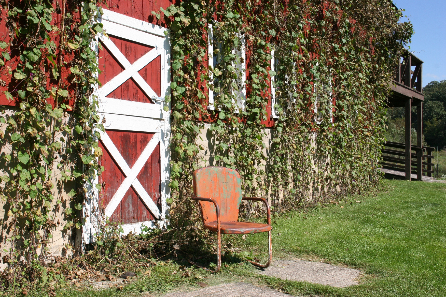Dying morning glories drape the Seed Savers barn accented by a vintage lawn chair.