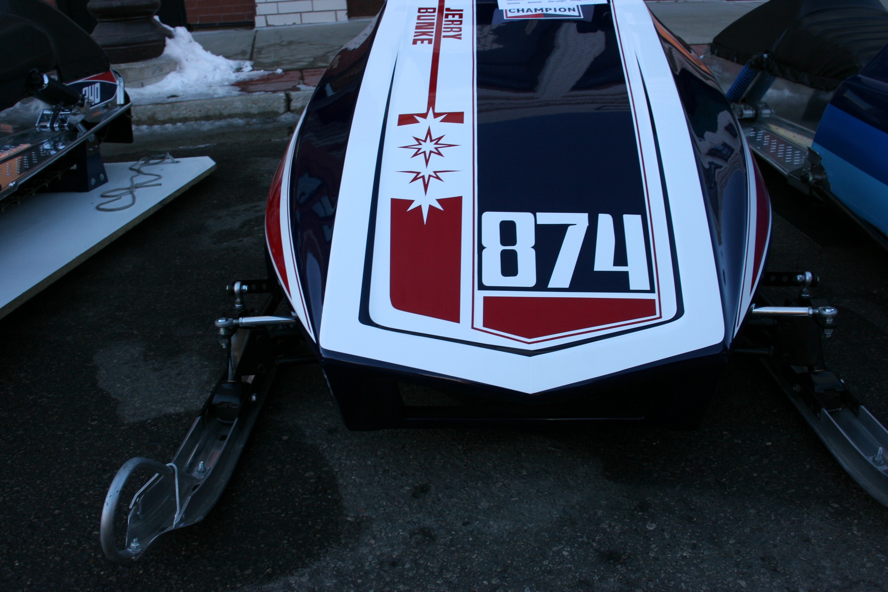 Vintage snowmobile show, #24 carrying Izzy close-up