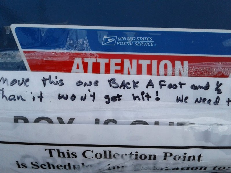 Like this example from Faribault. The local post office, several weeks ago, posted a note on a collection point mailbox that sits along an alley by the post office.