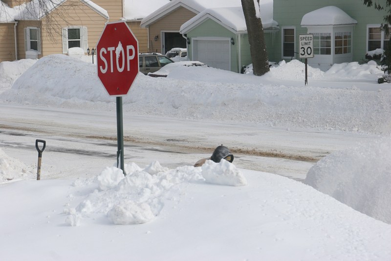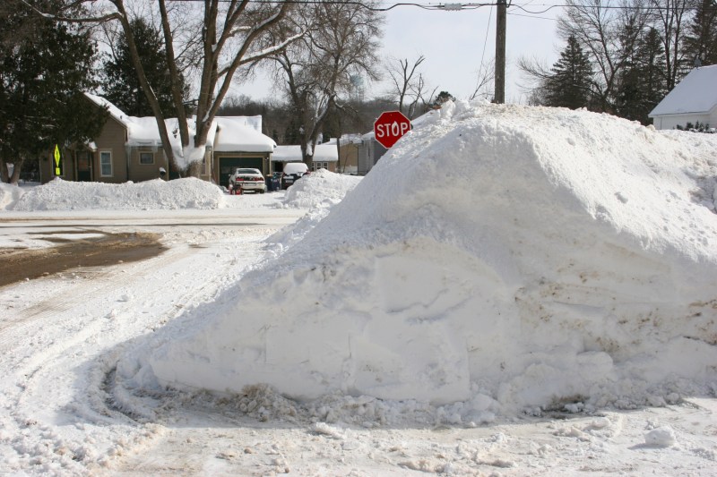 I stood in our driveway to show you the height of the snow piled at the end of the drive, on both sides. The stop sign on the street corner is barely visible from this perspective. Backing out of the driveway and pulling onto the roadway require caution as snow piles block vision lines.