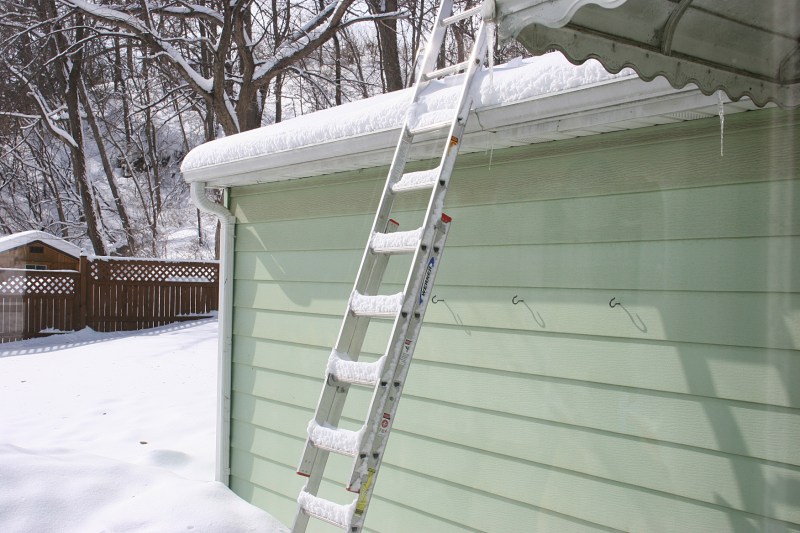 Randy finally decided just to leave the ladder outside, leaning here against the garage. He’s been on the garage and house roofs twice to shovel off the snow.