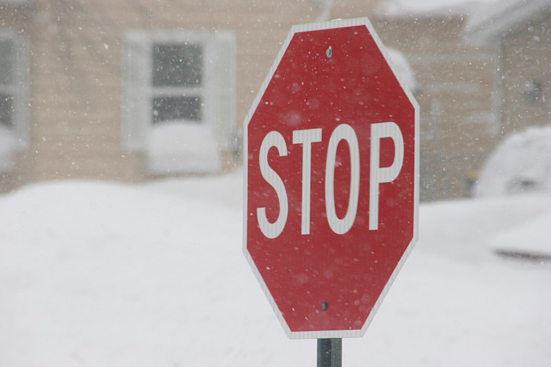 I stood in our driveway to show you the height of the snow piled at the end of the drive, on both sides. The stop sign on the street corner is barely visible from this perspective. Backing out of the driveway and pulling onto the roadway require caution as snow piles block vision lines.