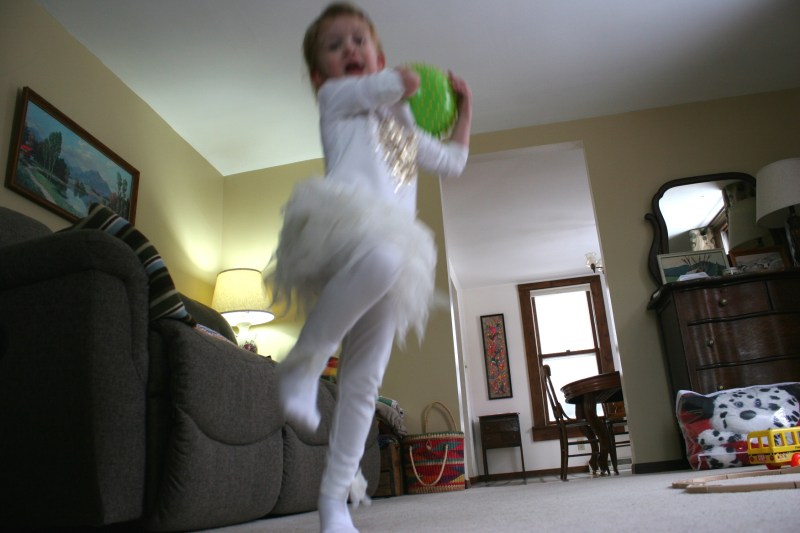 IN THE LIVING ROOM, a ballerina guides a train along tracks…