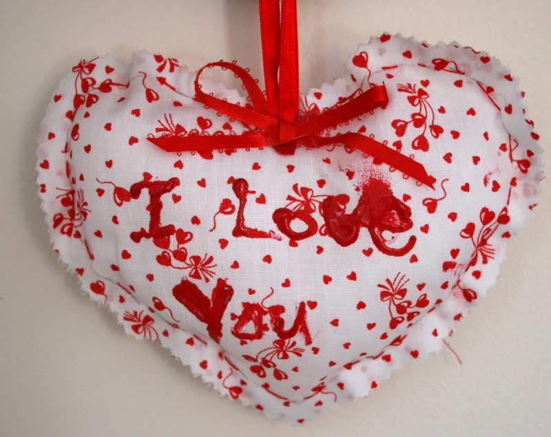 IT’S A SIMPLE FABRIC HEART. Puffed with stuffing. Hand-stitched with red thread. The words I Love You printed with red paint.