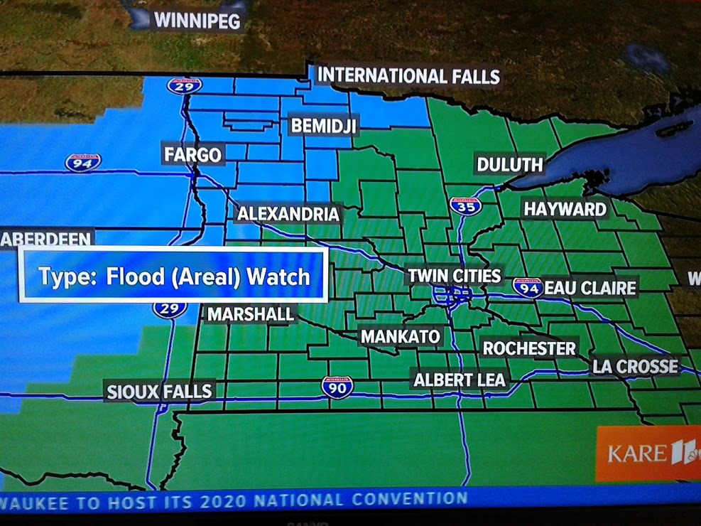 The green area on this map, covering most of Minnesota and into Wisconsin, is in a flood watch. The blue area is under a winter storm watch.