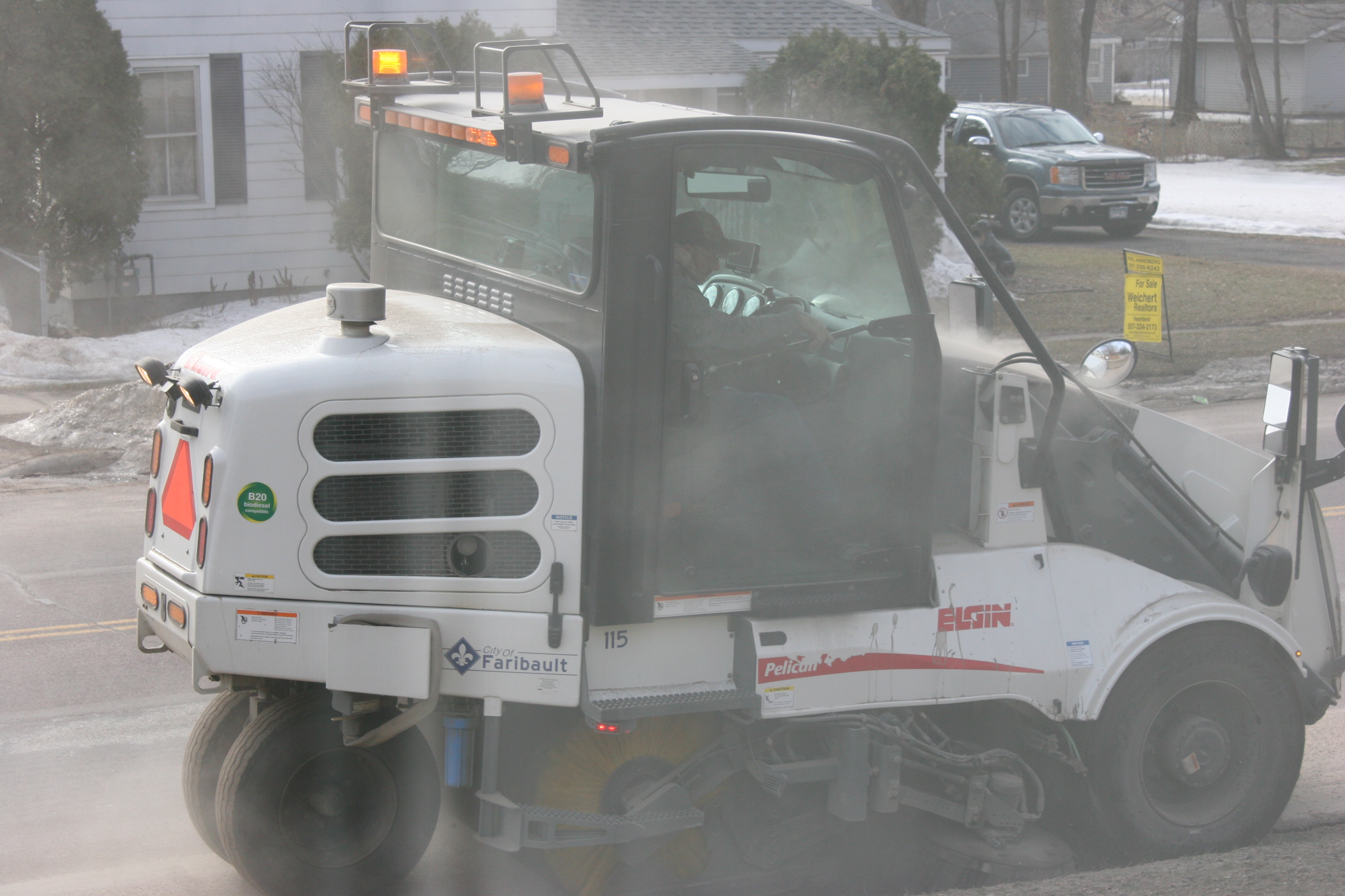 A cloud of dust envelopes the street sweeper cleaning Willow Street Monday morning.