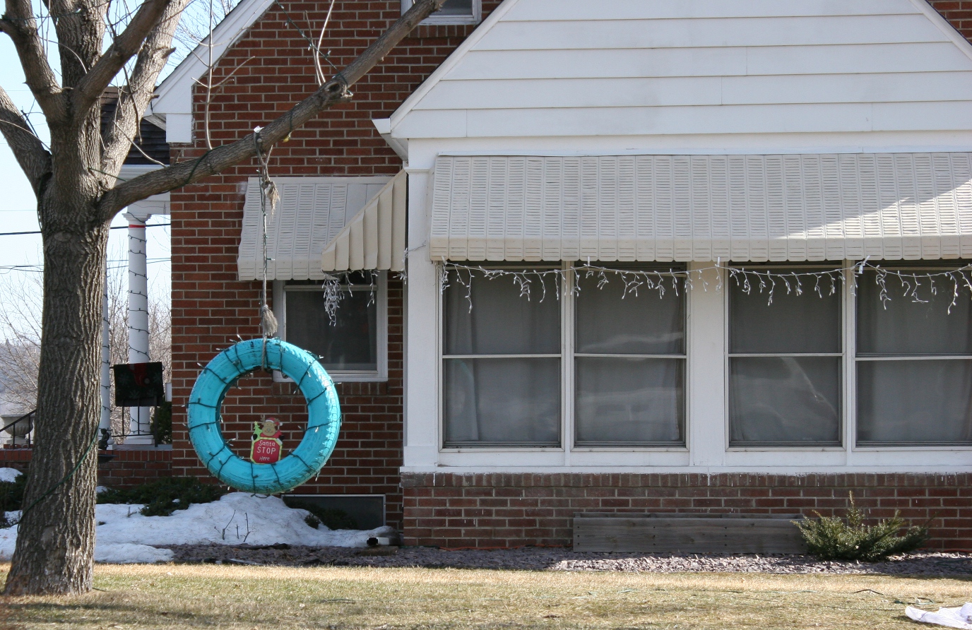 In a New Ulm yard, a sign on a tire swing says, “Santa stop here.”