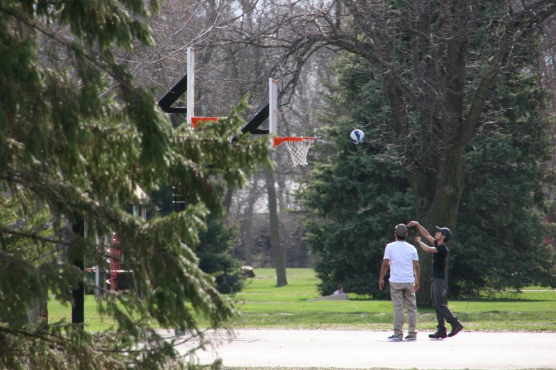 People biking and walking and shooting hoops.
