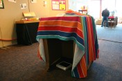 Front and center in the exhibit, fabric drapes over a cardboard box to create a fort.