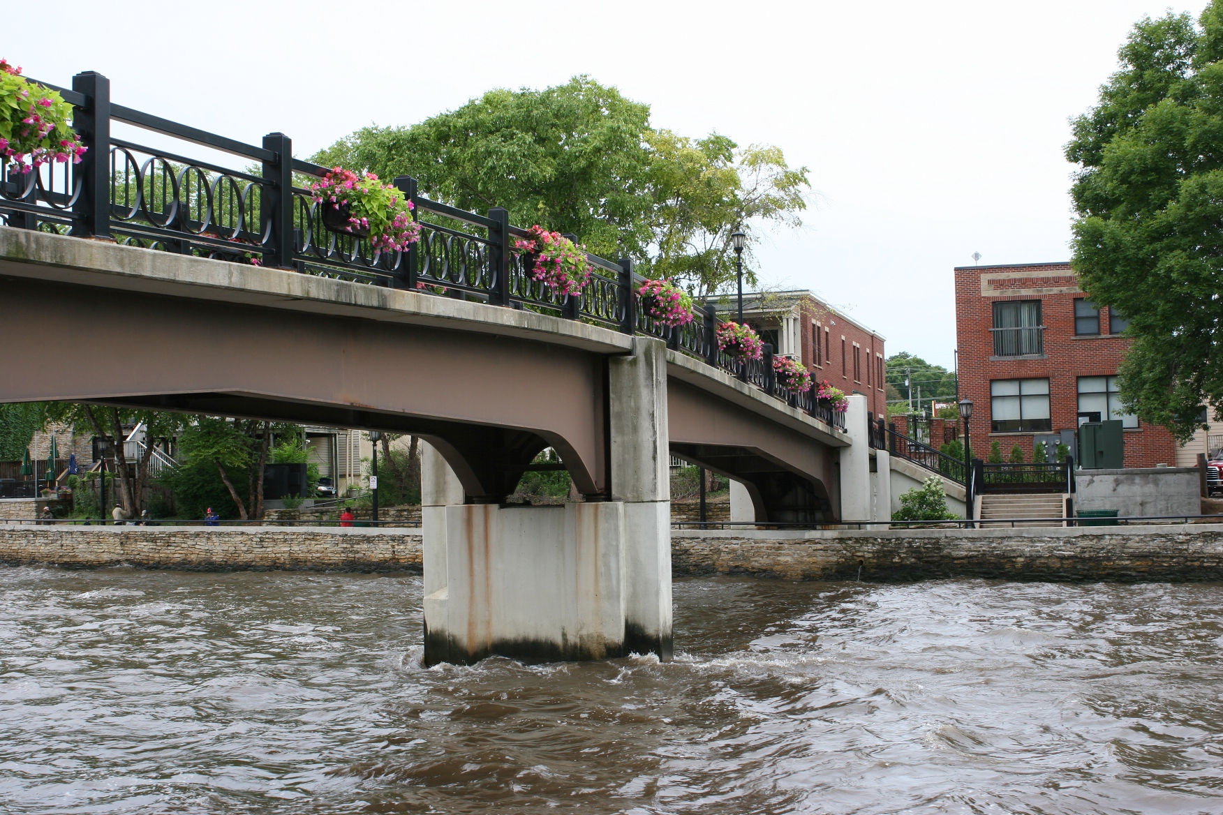 A pedestrian bridge crosses the Cannon River in the heart of downtown Northfield.