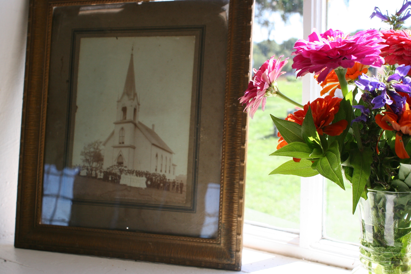 An historic photo on a window ledge inside the stone church.