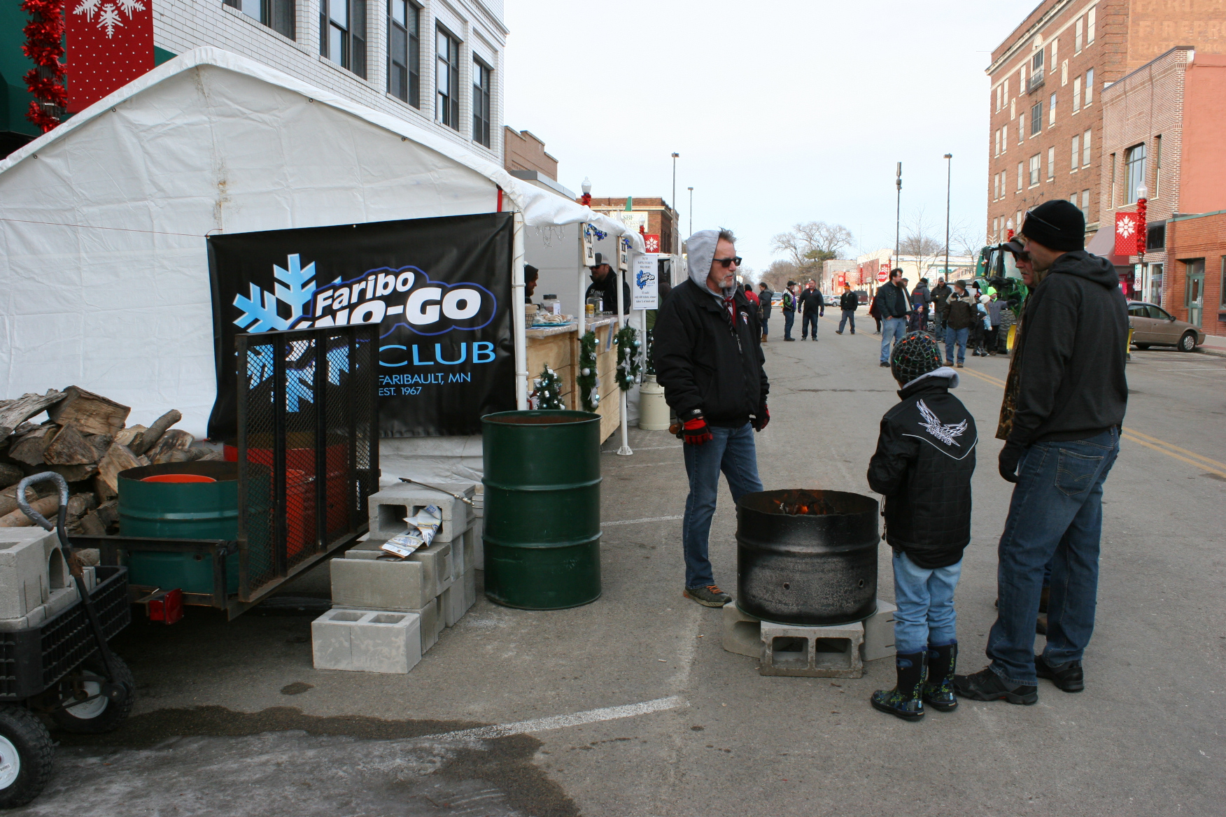 Warming up around the fire in low 30-degree temps and a brisk wind, next to the food and beverage tent.
