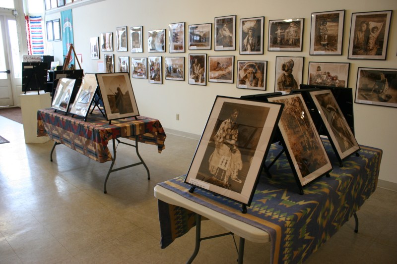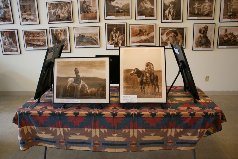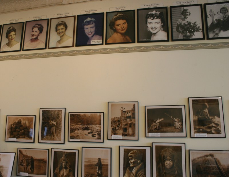 A permanent exhibit of Kolacky Days queen portraits hangs above the temporary exhibit of Edward Curtis photos of Native Americans.