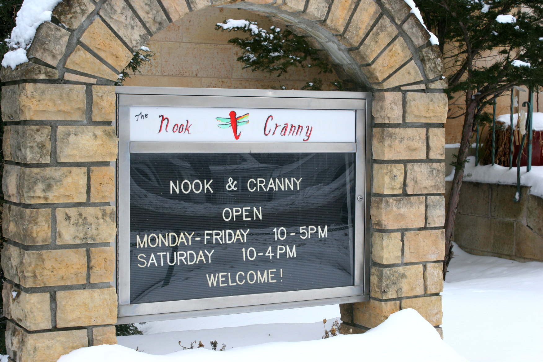Warming heads, hands & hearts in Faribault » Nook & Cranny, #6008 sign close-up