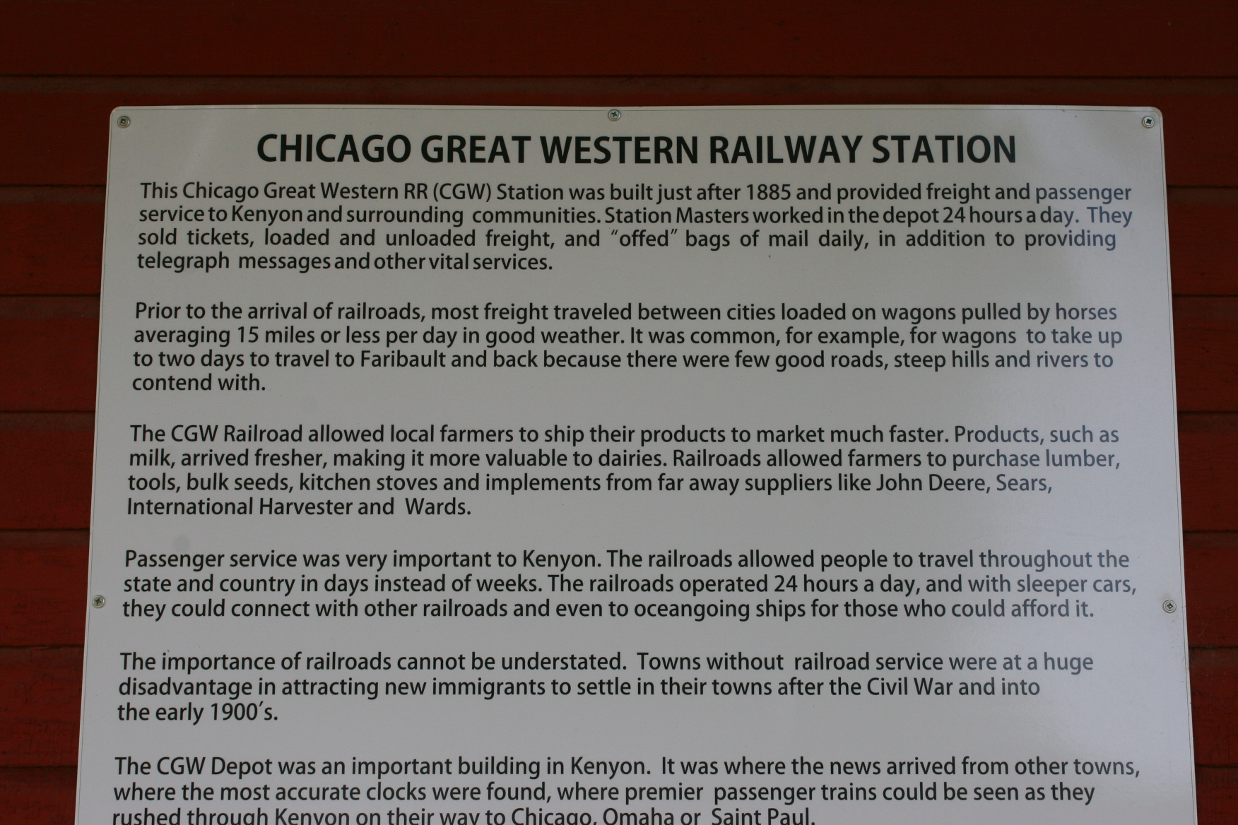 The history of the Kenyon Depot is summarized in an on-site sign.