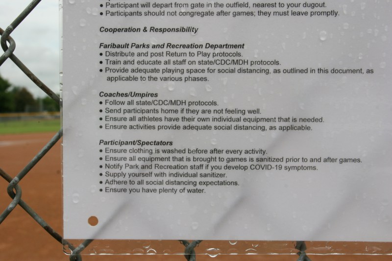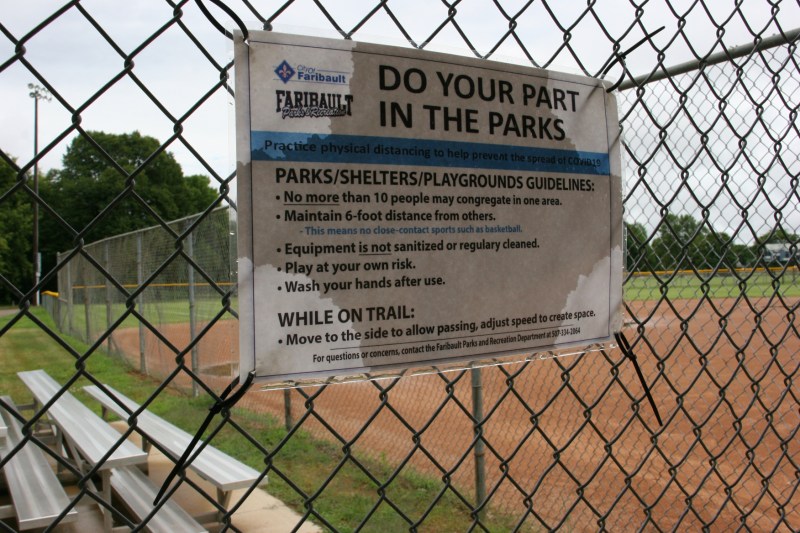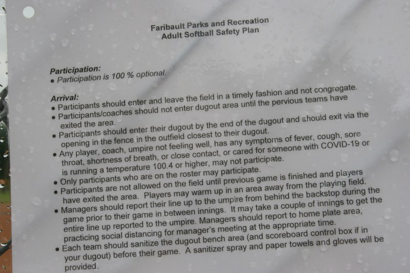 While out and about last Sunday, including a morning walk in North Alexander Park, I spotted an abundance of signage posted on fences at a softball diamond. I paused to read messages like the two-page Faribault Parks and Recreation Adult Softball Safety Plan, which focuses on health and safety as it relates to COVID-19.
