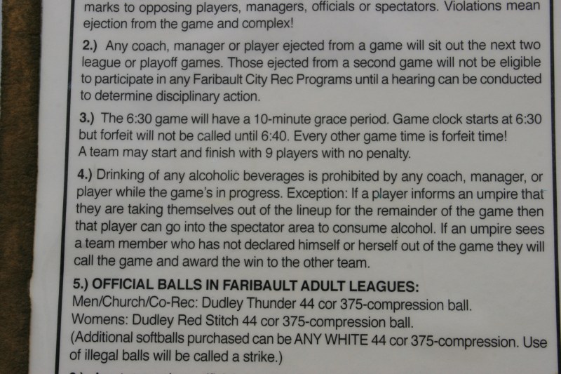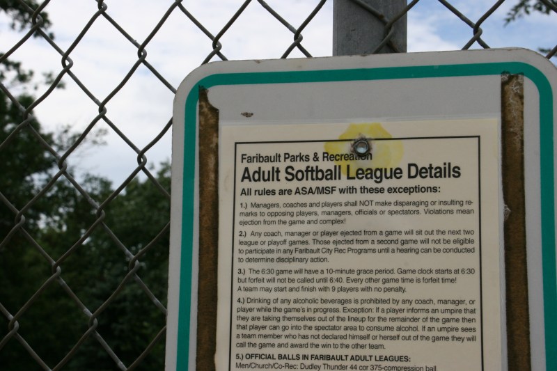 But then I found another sign—Adult Softball League Details—which has likely been here for some time and is posted inside the fence behind home plate. Of special interest was rule #4: Drinking of any alcoholic beverage is prohibited by any coach, manager or player while the game’s in progress. An exception allows a player to drink alcohol if he takes himself out of the game and goes to the spectator area.