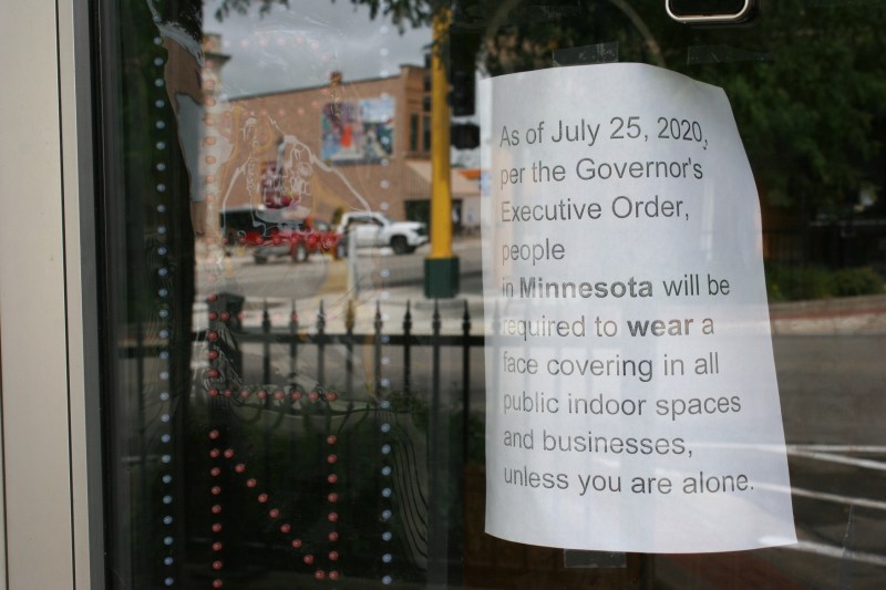 Businesses and other public places are required by the new Minnesota executive order to post signage requiring masks. This is posted on the door of a downtown Faribault business.