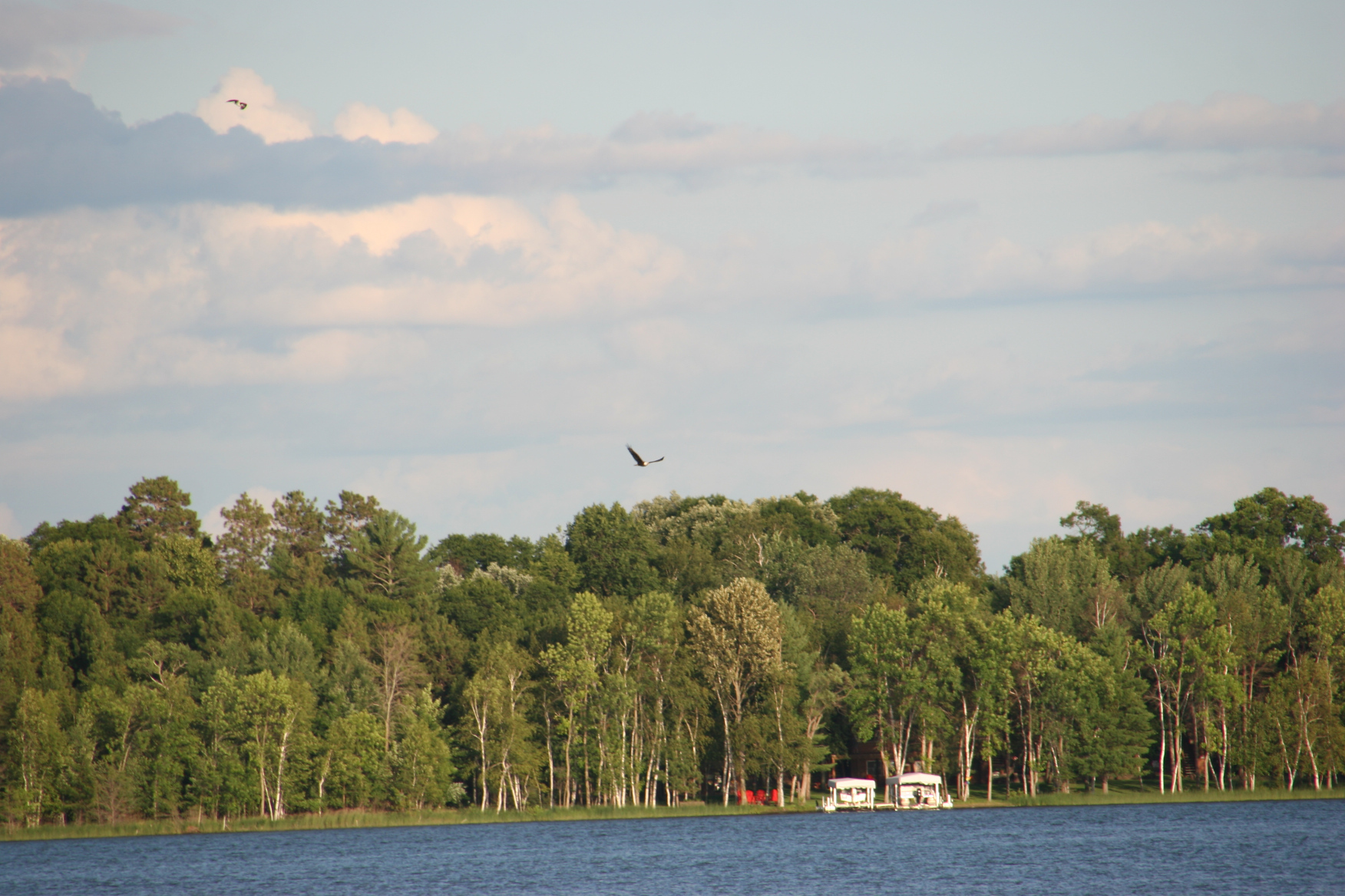 An eagle (s) flies along the lake.