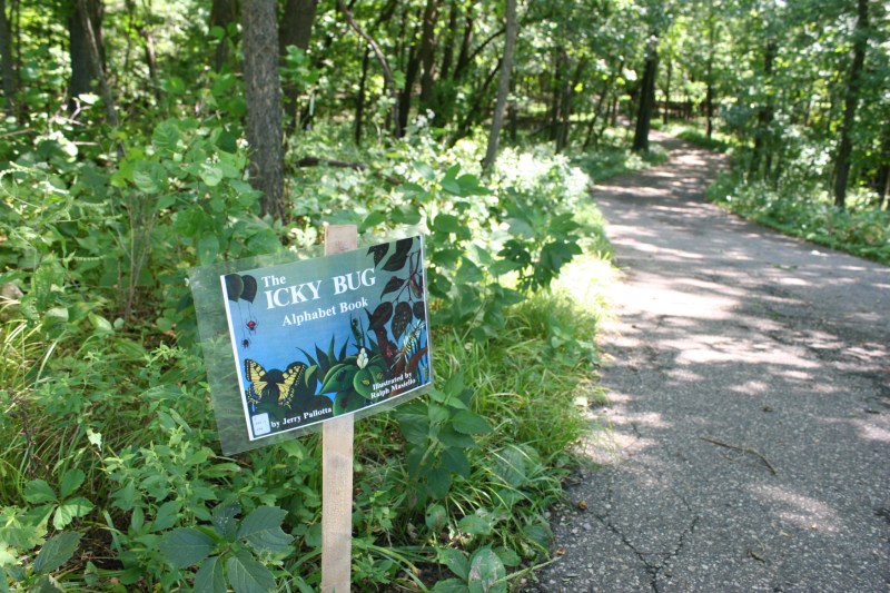 I found the bug book informative, which I expect was the intention, along with giving families something of interest to study while in the woods. The Northfield Public Library is doing a similar activity, posting picture book pages on posts in five public parks during August, calling these “Story Strolls.” In downtown Faribault, along Central Avenue, Buckham Memorial Library has also posted a Story Walk, featuring pages from Eric Carle’s Head to Toe. (I’ll post about that soon.)