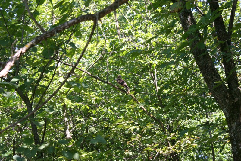 A few twists and turns later, I am still speed walking, driven to hurry by those biting insects. But then a bird catches my eye and I stop, speak Randy’s name. He doesn’t hear, fails to the see the bird so blended is it into the trees. I snap one photo before the bird rises, wings spanned wide. It appears to be a juvenile hawk. I am pleased with the hawk and deer sightings because we seldom see wildlife here, other than squirrels.