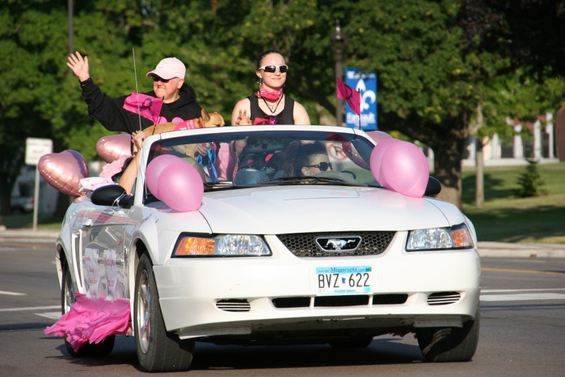 Pink balloons mark a convertible carrying cancer survivors and their pet dogs. The 2020 Relay for Life of Rice County is happening this evening, August 7, with a drive-through event at the fairgrounds.