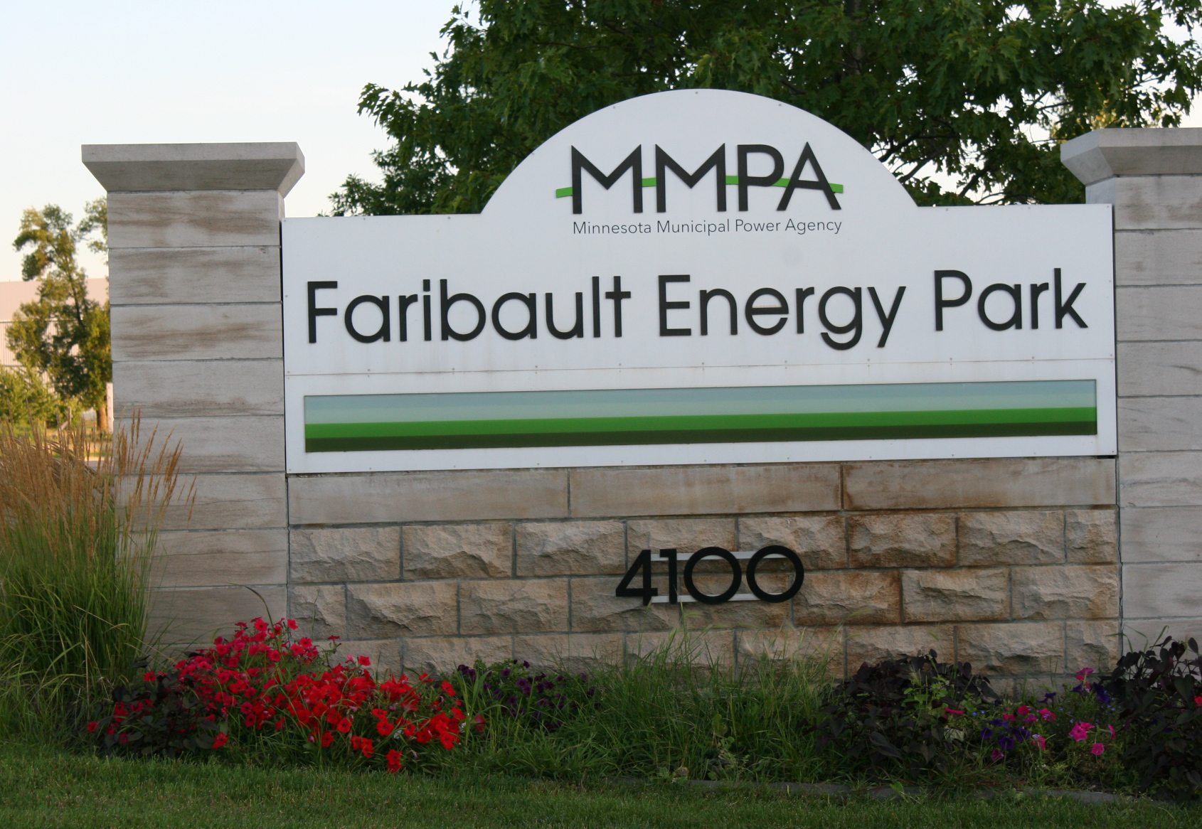 This sign marks the entrance to Faribault Energy Park on Faribault’s north side and visible from Interstate 35. It’s by the wind turbine on the northbound lane.