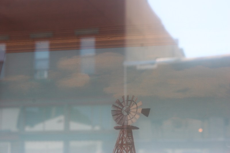 Glare made it really challenging to photograph Carol Ehrhardt’s entire cattle and windmill art. But I decided I like this image showing only the top of the windmill and the reflection of an aged building. Ehrhardt was awarded third place in the show.