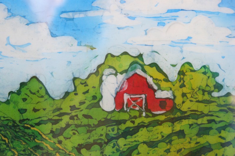 A close-up of Susan Hayes batik art titled “Summer Fields.”