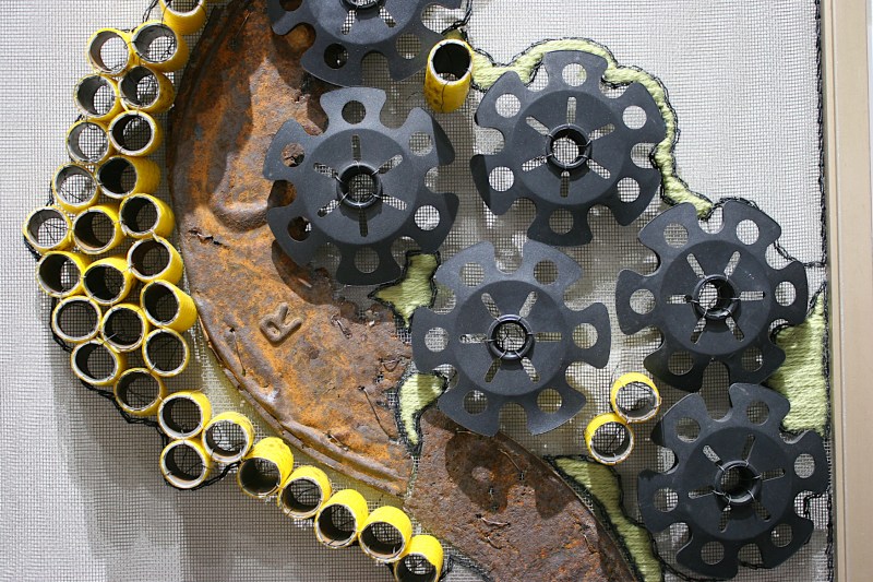 As I meandered through the gallery, I considered the Escape Artists’ art with the imprint of Kate’s portraits on my mind. For example, Theresa Harsma writes in her artist’s statement for “On the Ragged Edge” of sorting through her collection of found objects and choosing those that seemed to want to be part of the piece. Just like immigrants want to be part of the piece that is America.