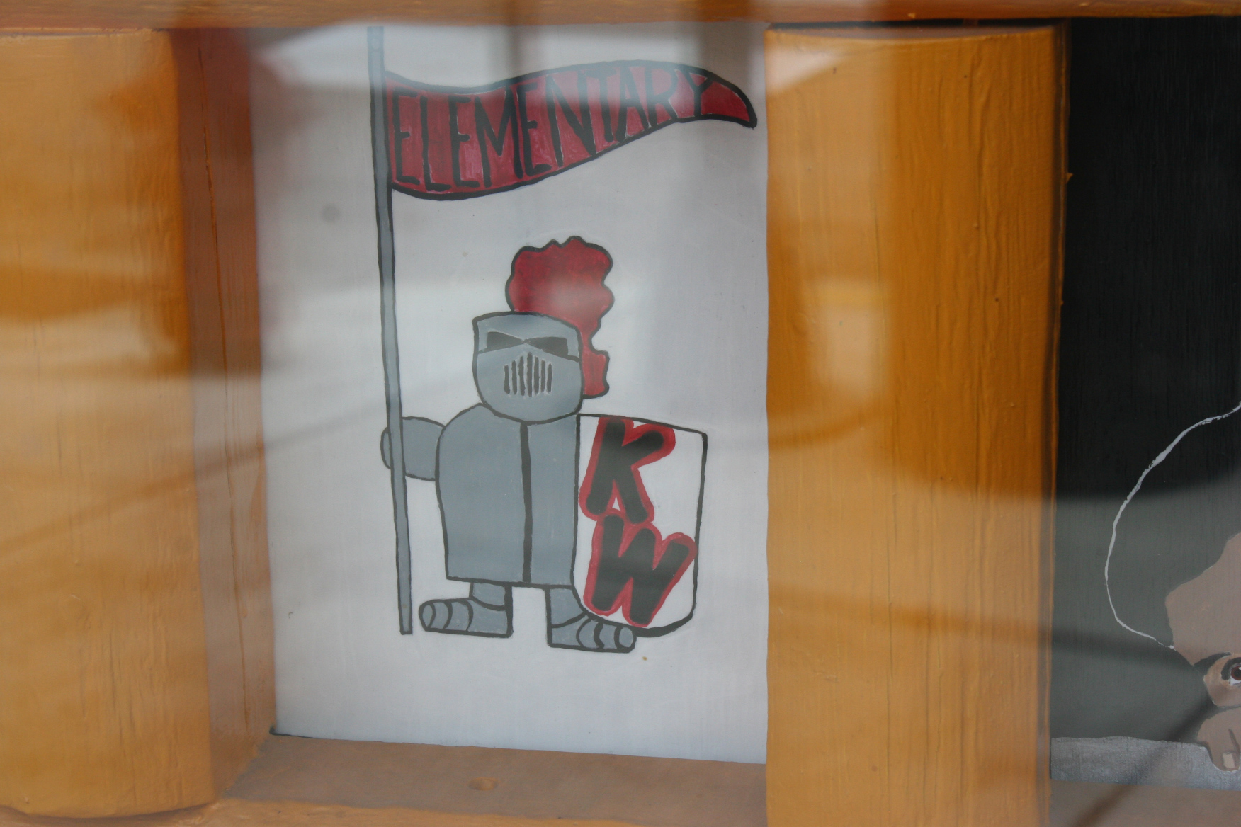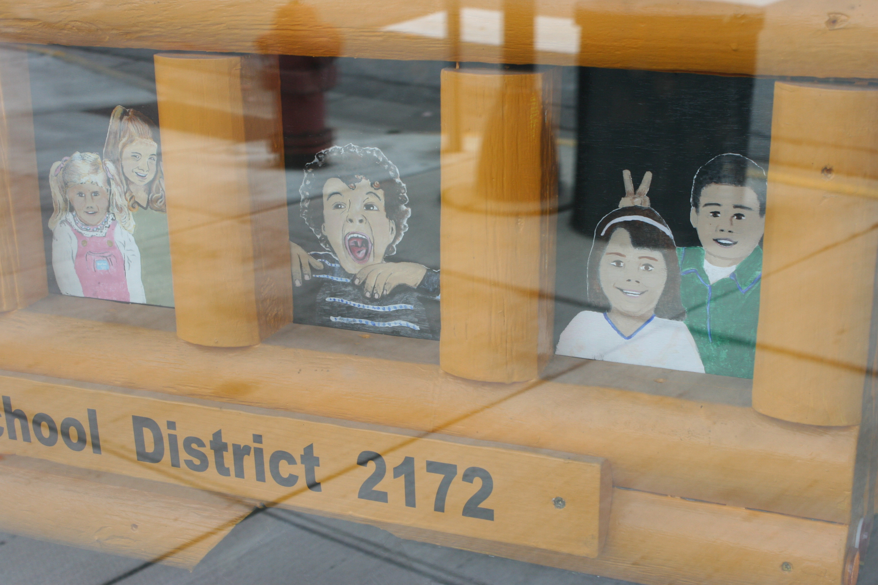 Photographing the window art proved challenging given the reflections. But I was determined to do my best. Someone worked hard to craft and create these educational-themed displays that show the importance of the Kenyon-Wanamingo School in this community—right down to the Knights mascot, the happy bus driver in the red cap and the smiling students. Yes, by that time I’d noticed two separate window displays, one an historic classroom and the other themed to school buses.