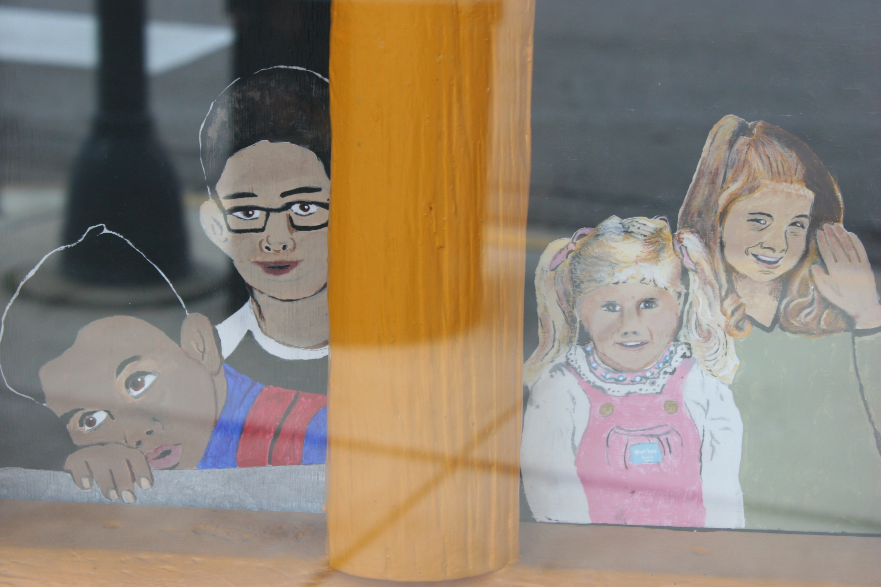 Directly in our line of vision stood a sculpture of children near a structure, which I soon determined to be an artistic interpretation of an historic covered bridge on the other side of the library. I planned, upon finishing my sandwich, grapes and protein bar, to photograph the art and then we would be on our way.