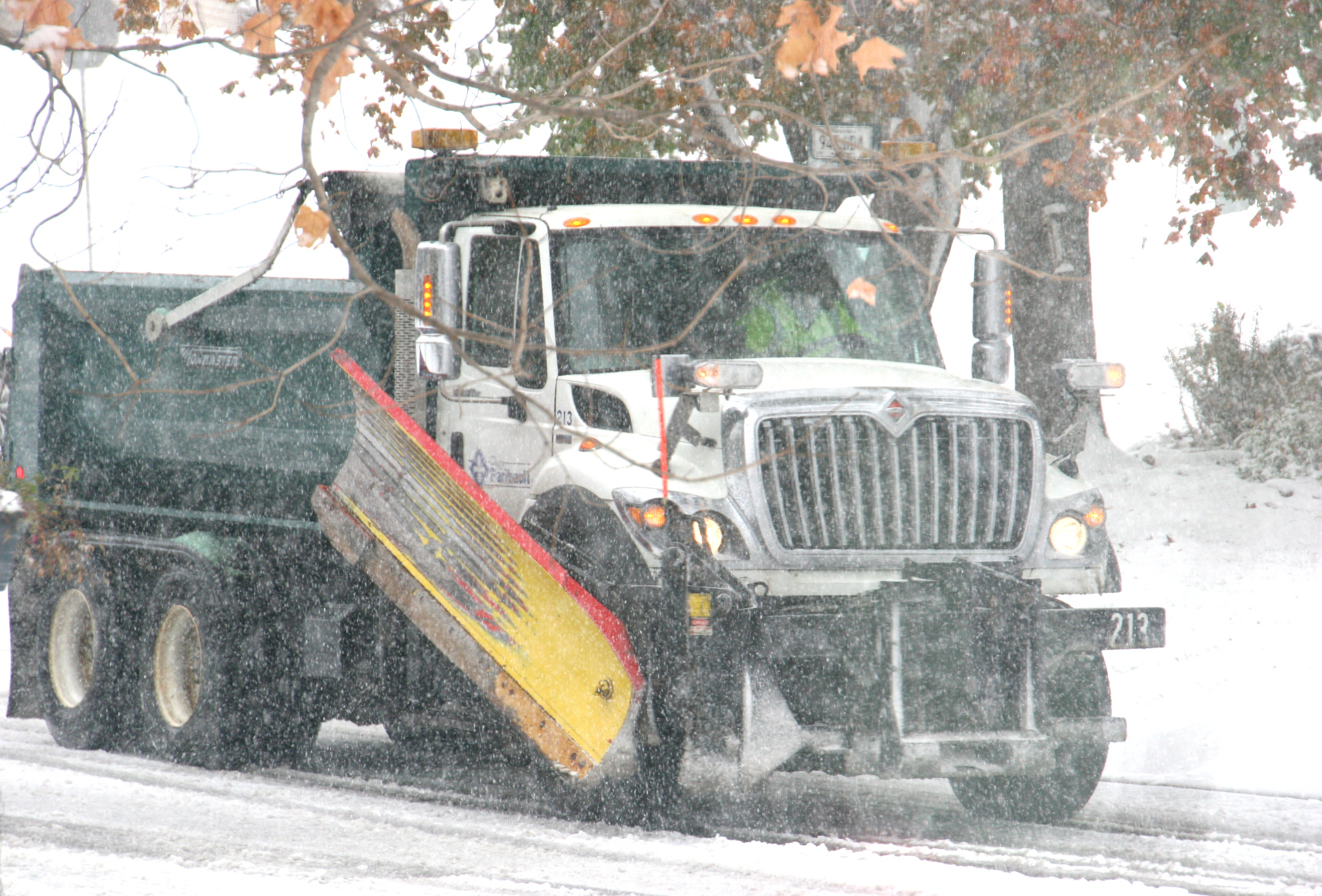 Already a city plow truck has sprayed a mix of sand/salt/chemicals onto the street at the bottom of a steep hill.