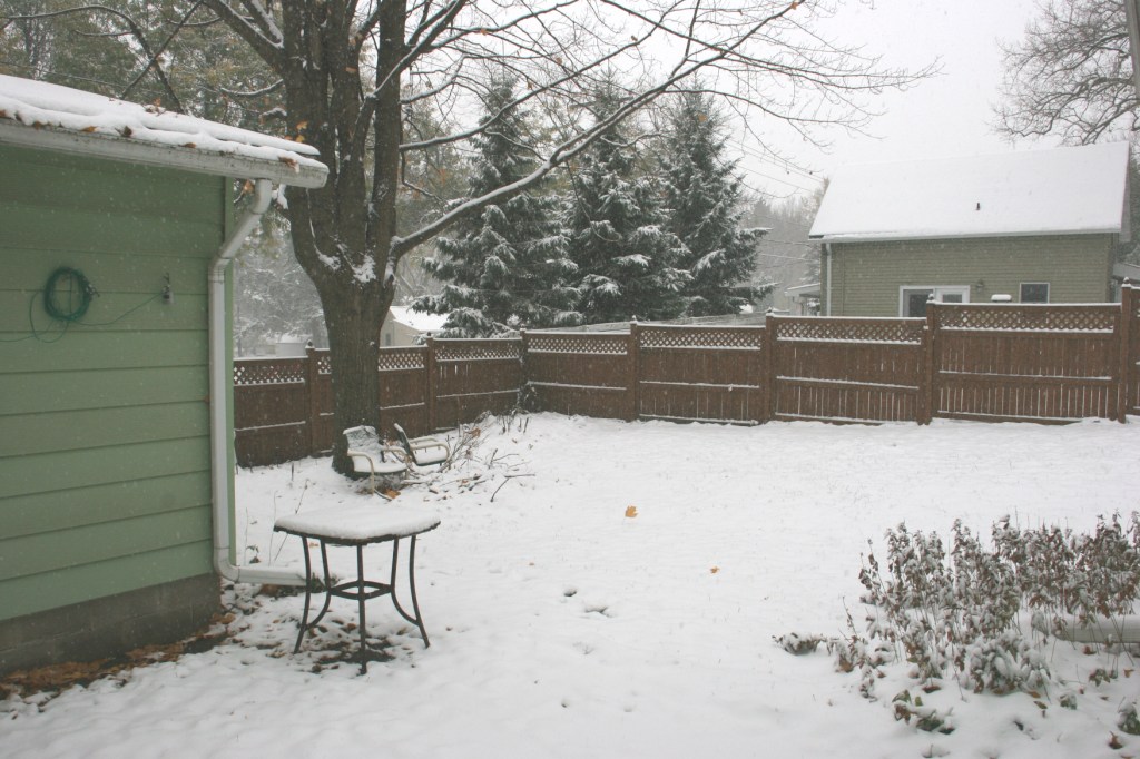 Across the street, snow piles atop jack-o-lanterns on another neighbor’s front steps, reminding me of the 1991 Halloween blizzard of 20-plus inches of snow here in Minnesota.