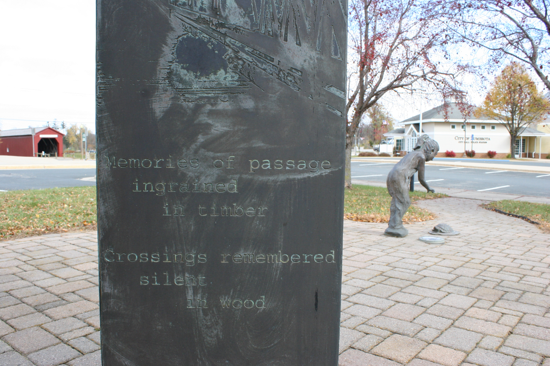 Some of the words inscribed on the sculpture. In the background, you can see the historic covered bridge.