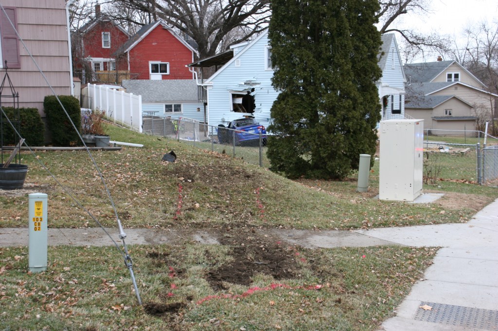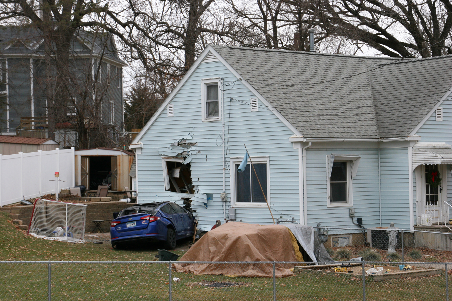 At that point, with nearly all emergency personnel clearing the scene, I headed up Tower with my camera. I passed by an angled vehicle blocking the street and was greeted by a police officer who asked if I was from the Daily News. I told him I was a neighbor, but that I sometimes work with the local paper. He seemed OK with that. I asked if everyone inside the house—a couple with two elementary-aged boys—was alright. He assured me they were, but declined to give the condition of those in the vehicle. Media reports state both the driver and passenger were taken to the hospital with the passenger flown to the metro and that the incident involved a police pursuit which was called off.