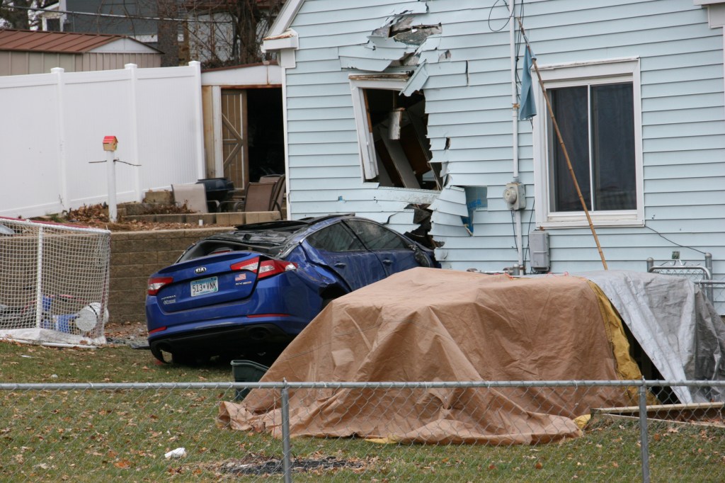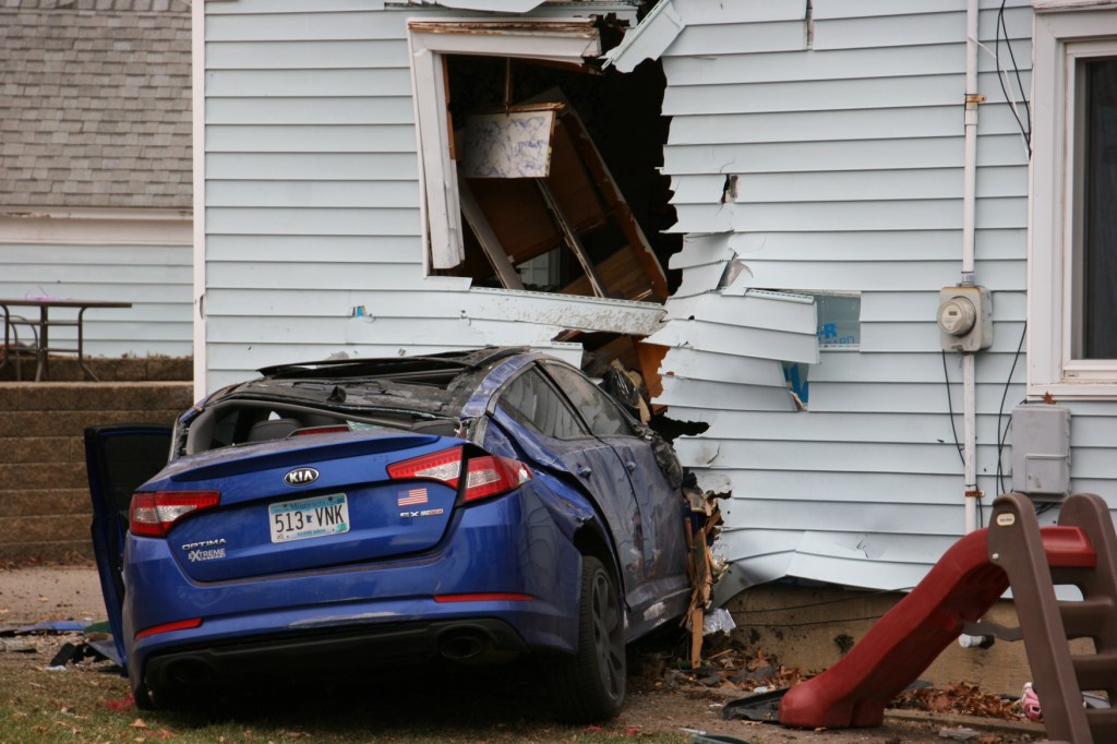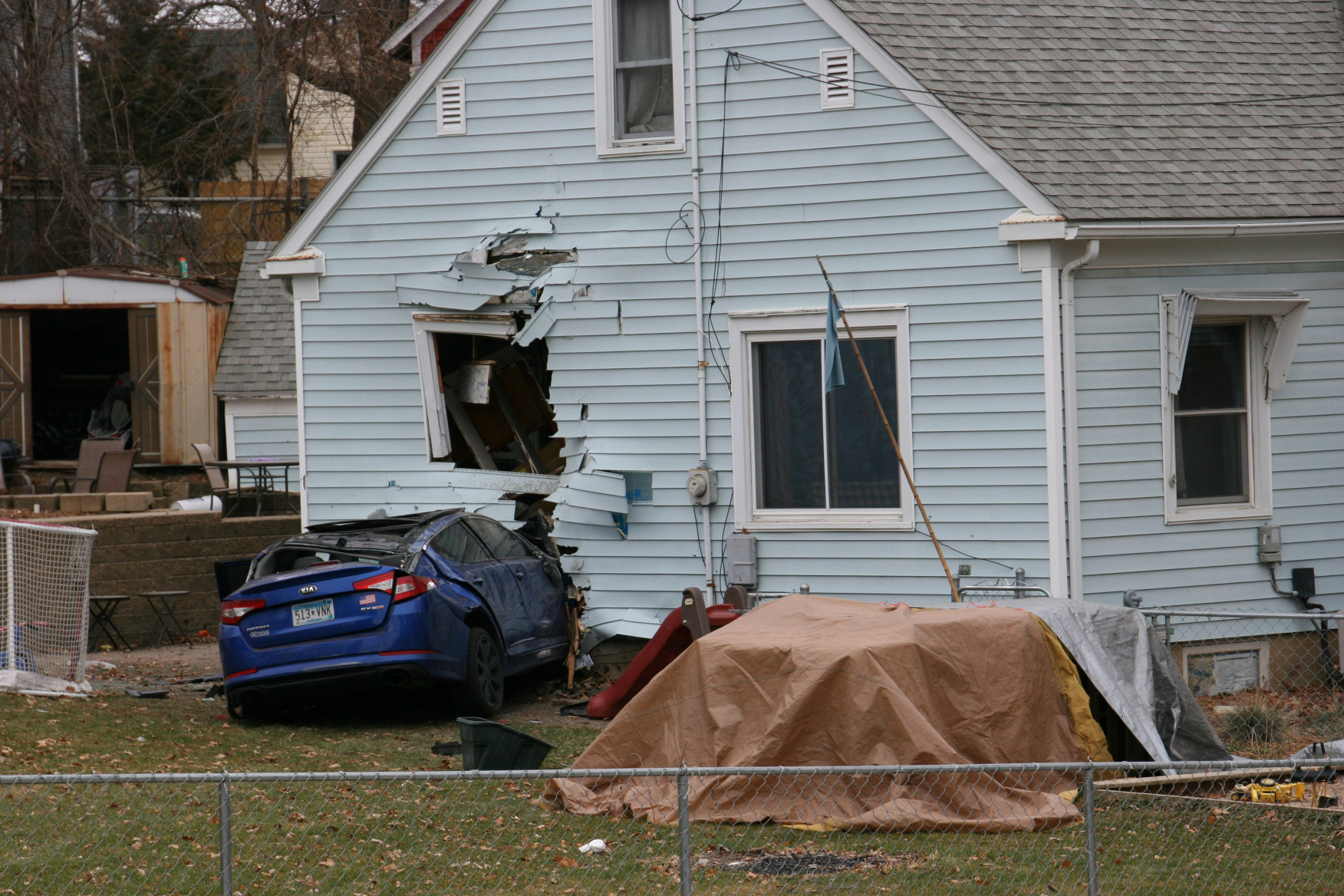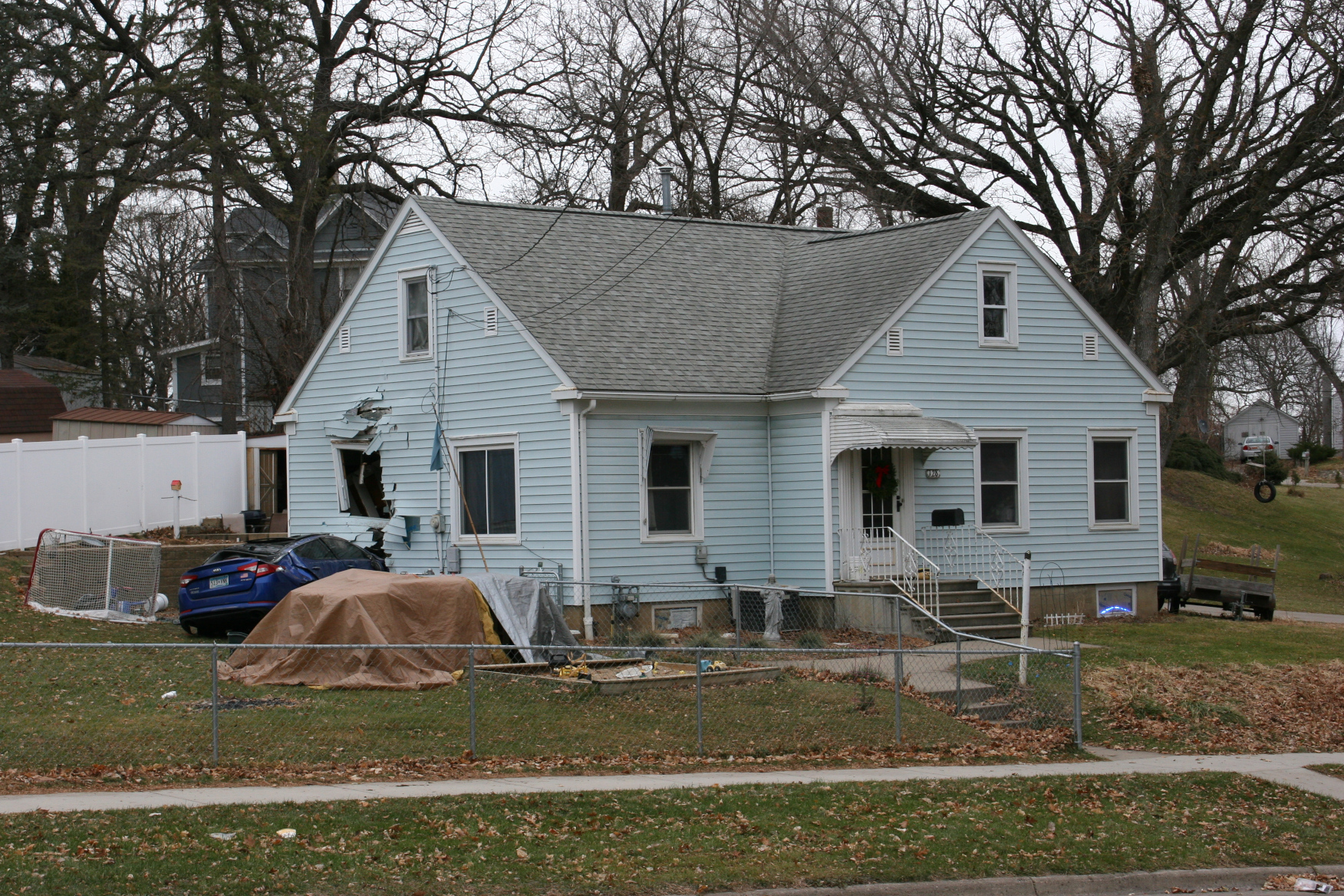 My first look at the blue KIA Optima lodged into the house at 128 Tower Place left me standing there in disbelief. The car apparently hit the house at a high rate of speed given the damage to both car and house and given the entire front of the KIA rested inside the home.